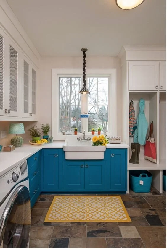 This spacious mudroom and laundry combi is made to look wider and airier by the white interiors and open windows. Inject fun to the busy space by adding pops of cheerful colours like the blue of the cabinet facing, the bright yellow on the rug and the pops of green from the potted plants.