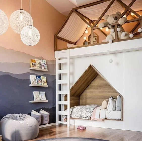 This delightful kid’s bedroom is modern and fun! The camper themed room includes a forest mountain mural, a sleeping space with a camper tent canopy and a comfy alcove below. Bright string ball pendant lights keep the room bright and the bare wood floors make it easy to keep the room clean and neat.