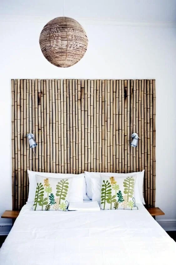 This bamboo headboard also serves as the base for the bedroom wall lamps. Bamboos exude a strong and cool element of exotic charms and warmth. Complete the spa-inspired bedroom look with natural elements, fern accents, and minimalist interiors.