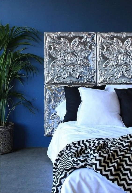 Shiny, detailed, and striking. This easy the assemble headboard will only need a few tin ceiling tiles, nails, or glue to install them to the wall, and a couple of hours to work on it. Quick and easy work for such a striking and beautiful result! Check out your nearest hardware store for your tile options and designs.