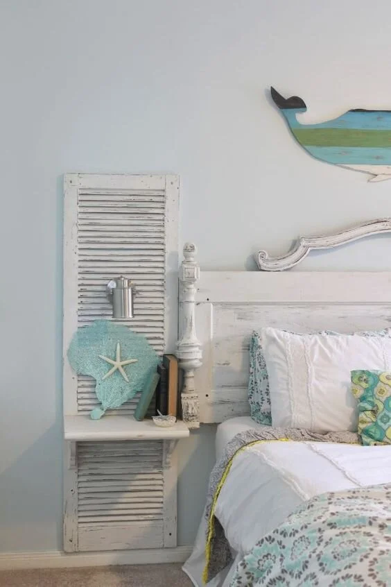 Do not throw old doors and window shutters just yet. You can transform these into chic and charming headboards for your home! This coastal design white bedroom features ocean-themed accents and repurposed door and shutters for headboards. Shabby chic and beautiful!