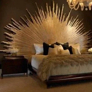 Stunning and luxurious, elegant and fabulous! This golden sunburst headboard is designed to impress! Its delicate spikes reflect the light from the chandelier, bathing the bedroom in a warm glow. Dark walls and fixtures add drama and keep the room from being overly bright.