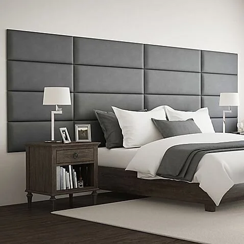 Very modern, sophisticated, and unpretentiously classy. It highlights the bed without hogging attention. These sleek grey suede panels complement the modern minimalist theme of the room. The extended width design also includes the night tables.