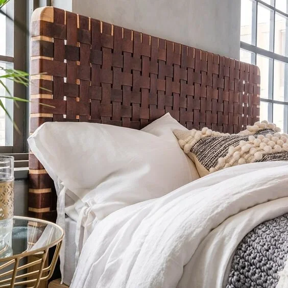 Add a lovely touch of rustic boho to your modern bedroom. This teak and woven leather headboard is easy to create. You can use leather in its natural shades for boho and farmhouse themed bedrooms, or in coloured leather for modern and contemporary designs.