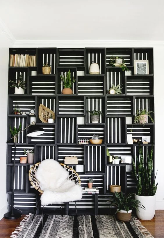 This sleek and stunning wall shelving is made of used wooden crates! Carefully cleaned and sanded, the crates are then arranged, put together and painted before it is installed against the wall. This will fit right into any modern home designs.