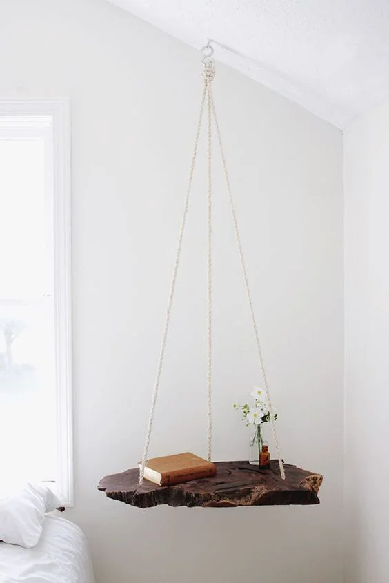 Quirky, exceptional, unforgettable. This simple DIY project will give your room character and lots of rustic charm. Find a good-sized wood slice. Clean, dry and paint or varnish it. Drill three holes around its rim and pass through ropes to hang.