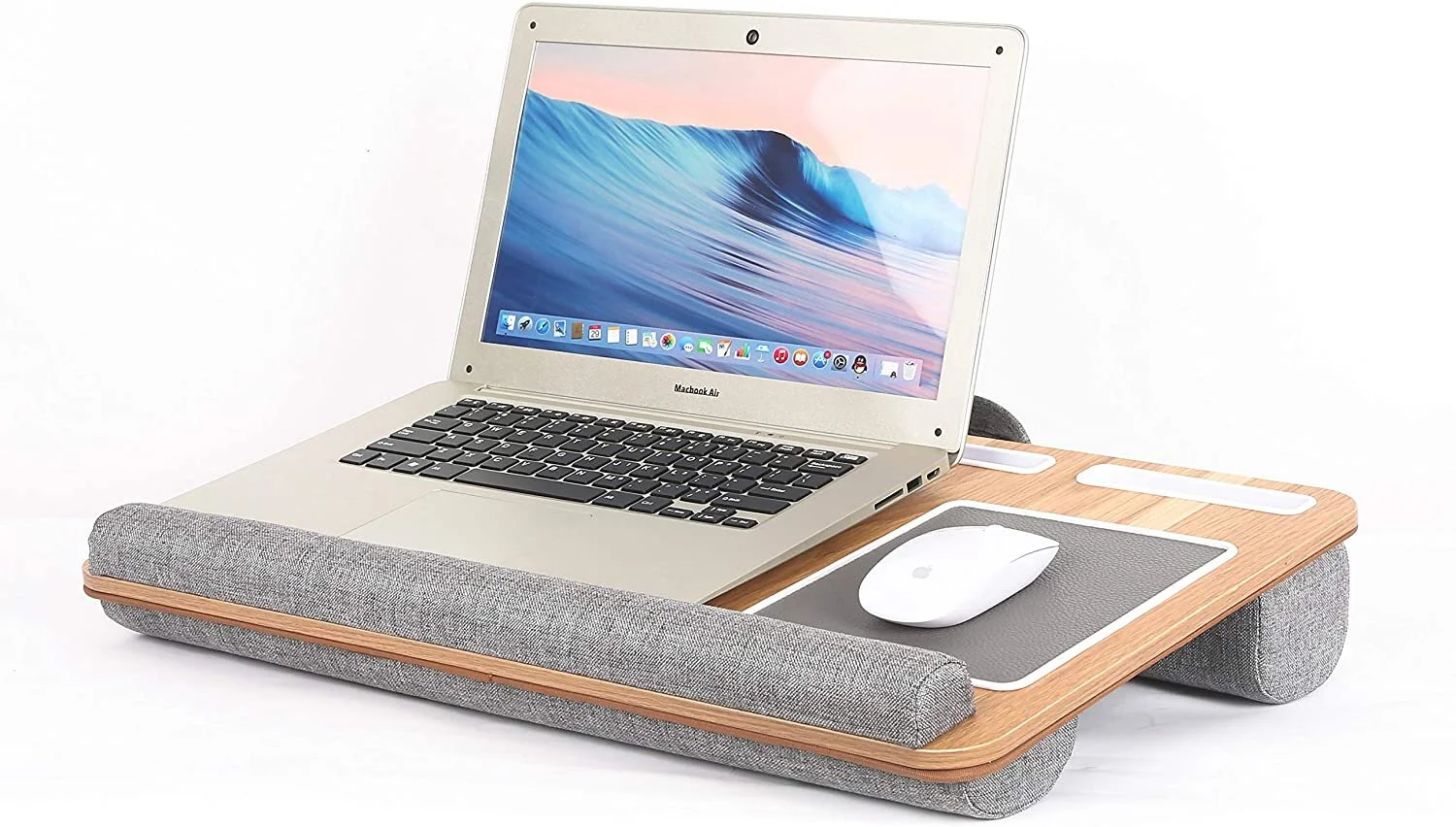 Work anywhere in the house with this portable lap desk. The lightweight and comfortable design include a sleek bamboo desk, under cushions for leg comfort and elevation, wrist rest, a built-in mouse pad, a mobile phone stand, and slots for small office items like pens, pins, and clips.