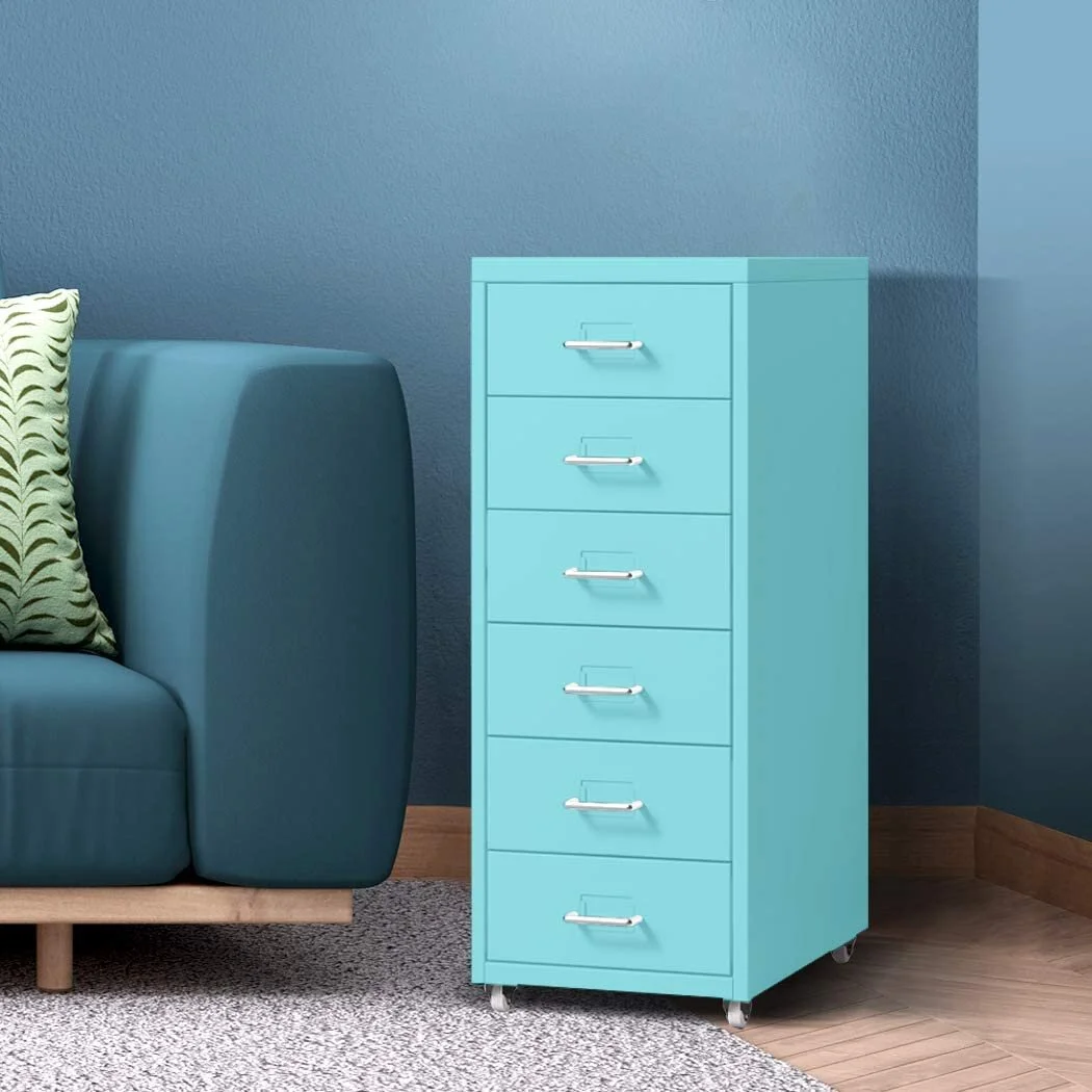 Keep your office stuff safe and organised in this colourful and functional office storage cabinet. The mobile, no-rust steel cabinet includes six drawers and comes in red and turquoise colours. Its sleek and slim shape is a space-saver.