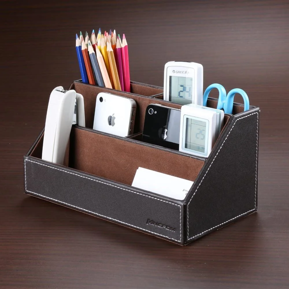 A handsome desk organiser that is also super functional. This leather desk organiser features dedicated slots for various office items – pens, staplers, pins, cards, slips of paper, notepads, and the ubiquitous cell phone. It comes in white, brown, and black.