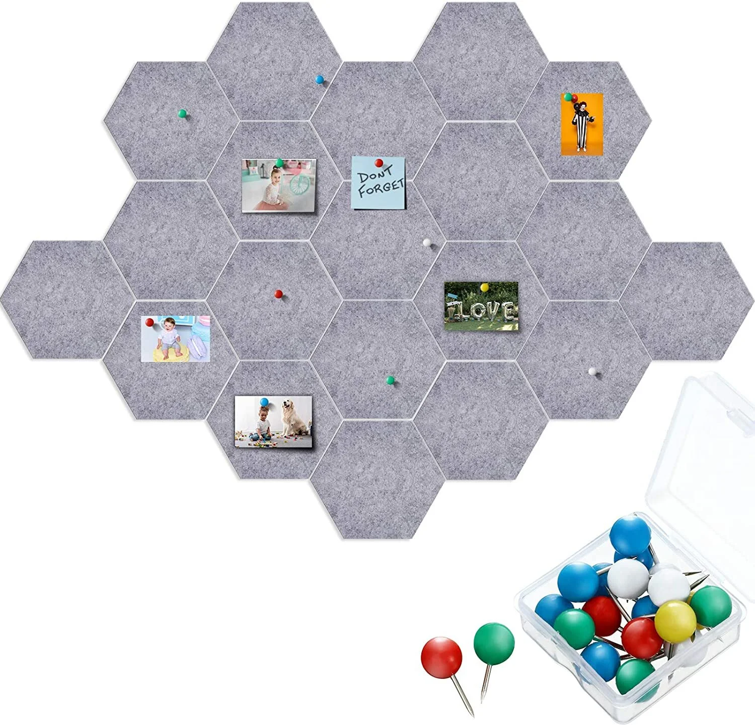 Trendy and attractive, this hexagon pelt tiles give your office a fun and creative highlight. You can arrange the tiles to fit the wall or as you prefer. Great for organising and/or decorating. One pack contains 20 tiles and 40 pins.