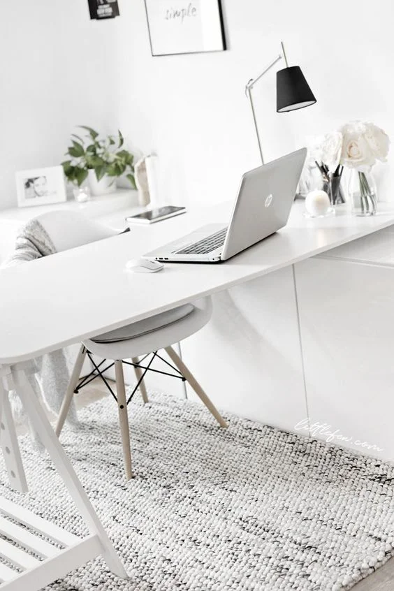 This white Scandinavian home office design features the cool icy shade of the north. Black touches on the rug, a potted plant and black accents relieve the starkness of white. The white minimalist desk is supported by a sawhorse base on one side and by the cabinets on the other.