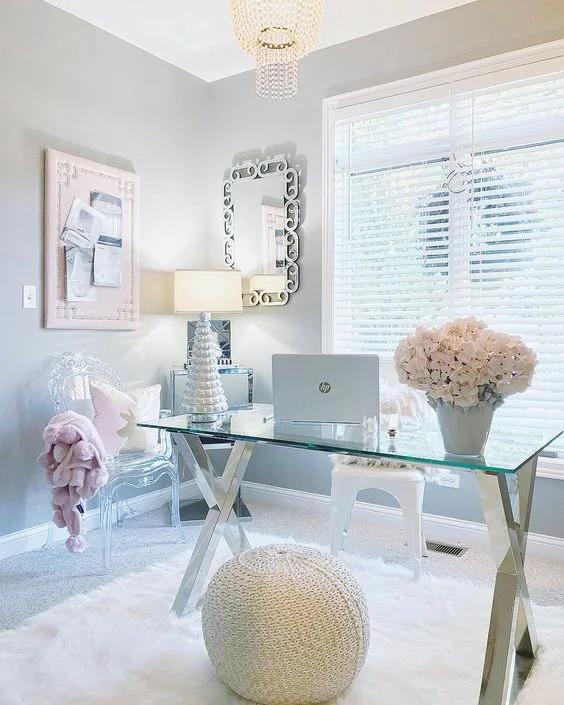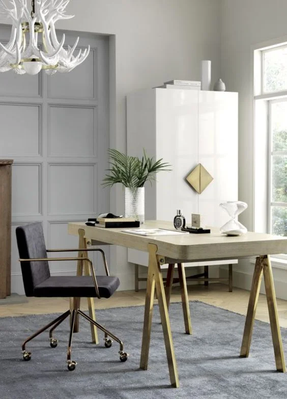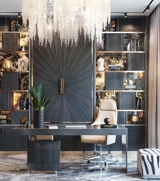 This showstopper of a home office comes with prominent grey tones including its dark grey wood and steel office desk. The sleek design includes a smooth top and a panel of drawers on one side. The fabulous chandelier and beautiful marble floors complete the luxurious look of the room.