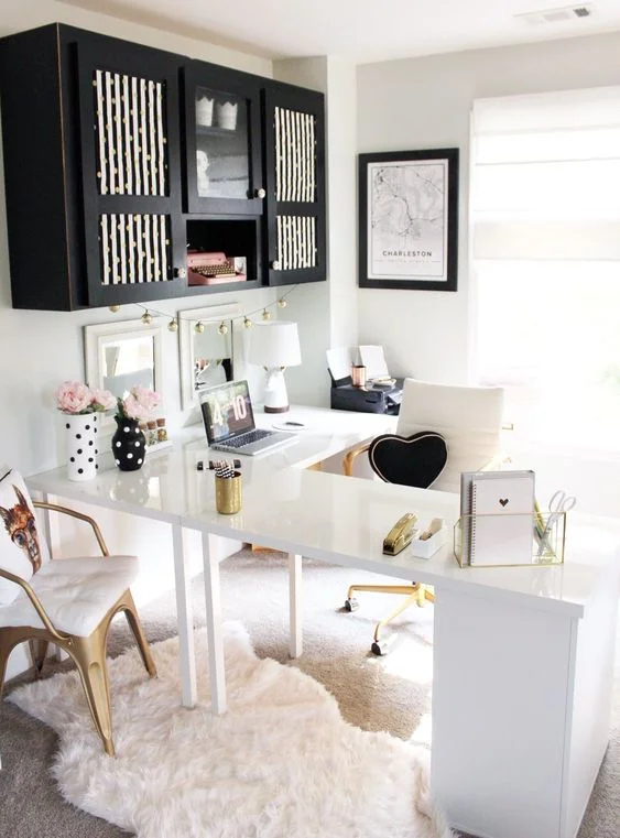 This chic and bright white home office features an L-shaped desk. The ample space of the desk allows its user to separate the working or thinking area from the consulting or collaboration side.