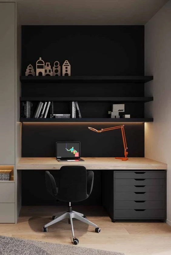 Wall and shelves offices can get a boost in efficiency and design from underlighting. Adding LED or recessed lighting under the shelves will define the space and provide illumination where it is needed.
