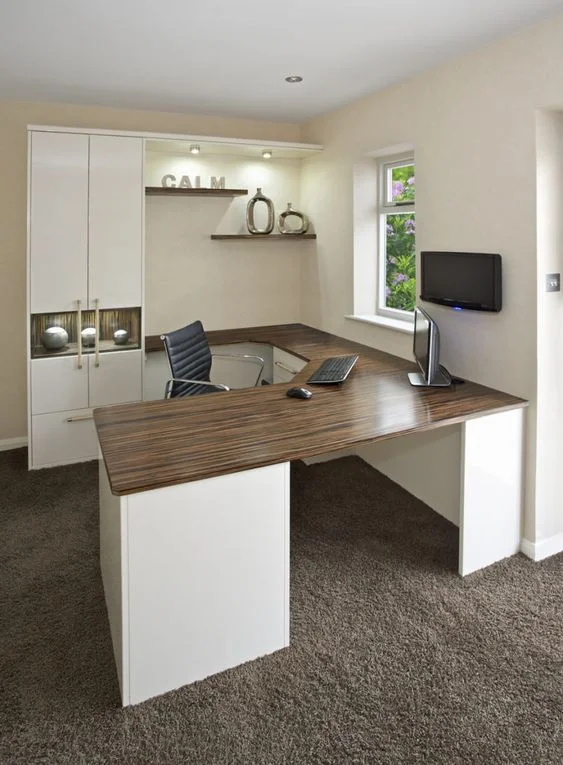 Creative planning and efficient design can turn an odd nook into your home office. The office desk is replaced by a counter on two sides. Shelves for storage are installed on the upper walls to keep them out of the way.