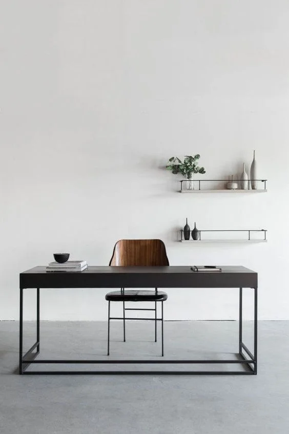 No superfluous, just the essentials. This extreme minimalist home office design features a dark grey welded steel office desk with a matching chair. The clean top and lines leave no room for clutter, fuss and fluff.