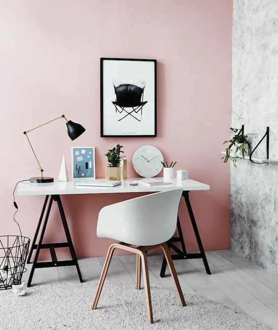 Smaller offices are in style. This wall and shelves home office features a floating shelf instead of a desk. Set against the wall, the design is space-efficient and modern. Just add a couple of sleek chairs and you’re set.