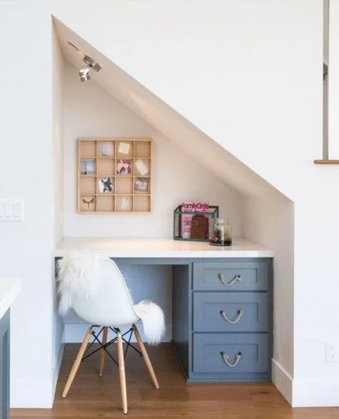 No room for a desk? No problem. You can use the awkward space under your stairs and convert it into a centrally located home office nook. A built-in desk is ideal so you can design it according to the space and your needs.