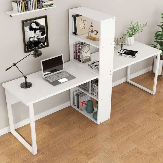 This tandem home office design is best for couples, kids’ study station or for apartment roommates. The space-saving design features a long desk divided into two separate workspaces by a shelf, which also serves as a storage and organiser.