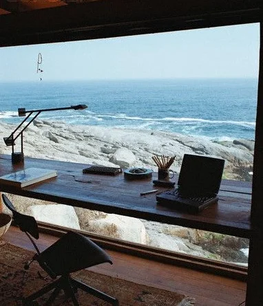 Don’t let a magnificent view from your house go to waste. Enjoy it everyday by setting up your home office right where you can see it. This home office features a counter for a desk, set up next to a glass wall overlooking a craggy beach. Great view and work motivator!