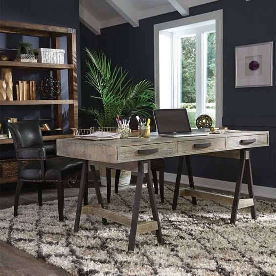 The combination of black steel frames and wood tops give this office desk an edgy yet appealing rustic industrial look. Thick butcher’s block tabletop gives a hint of farmhouse charm.
