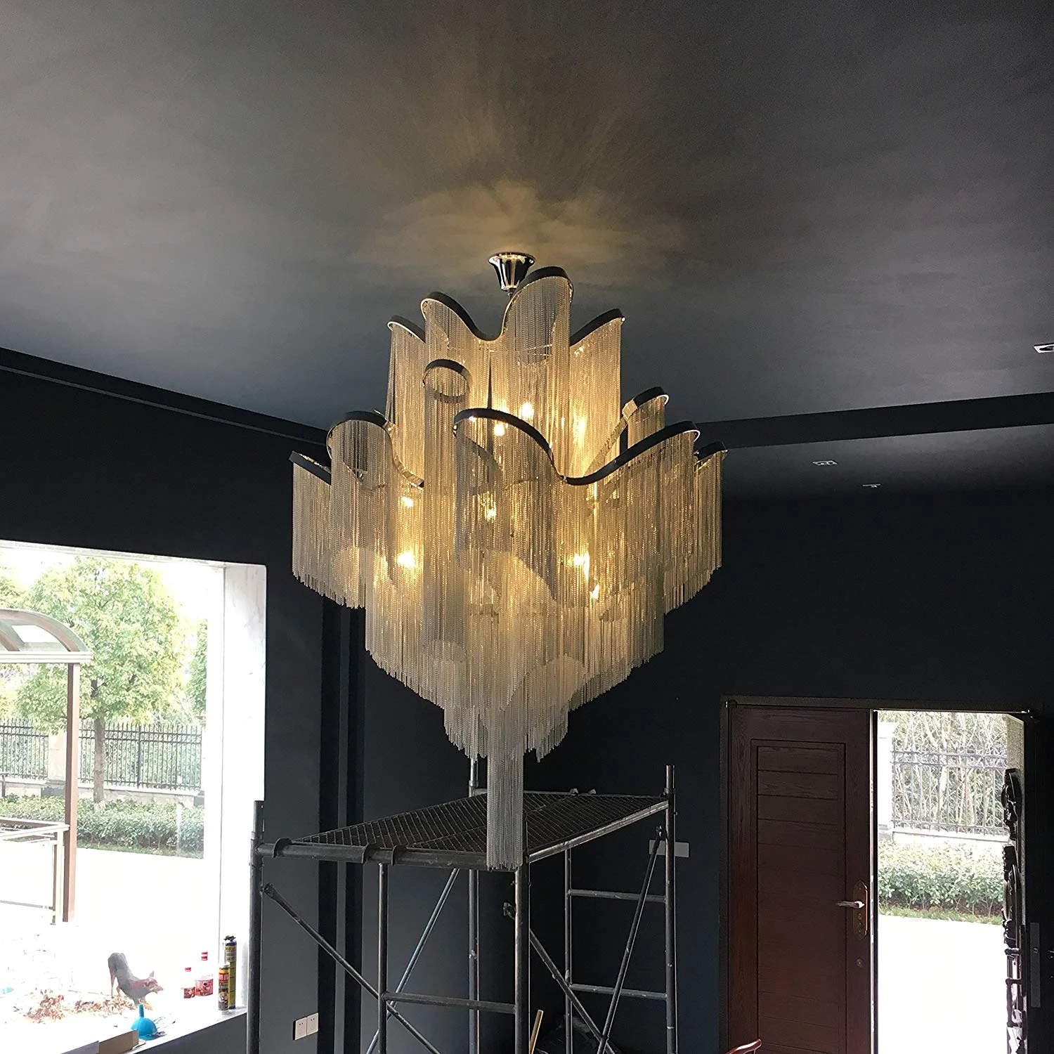 Wispy metal chains hang from three layers of aluminium strips form a delicate shade to create soothing light. This chandelier delivers drama, luxury and style to any room in the house.