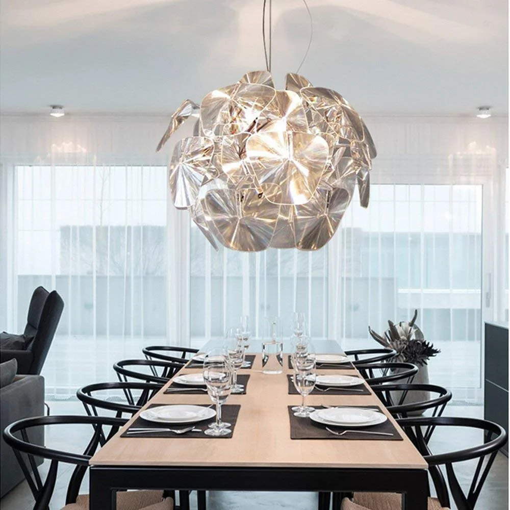 The distinctiveness of this modern abstract lamp is key to its beauty. This acrylic pendant chandelier does more than just light up your space, its striking look can take the focal point of the room. The random panels diffuse the light resulting in a warm glow ideal for spaces like the bedroom, dining room or the living room.