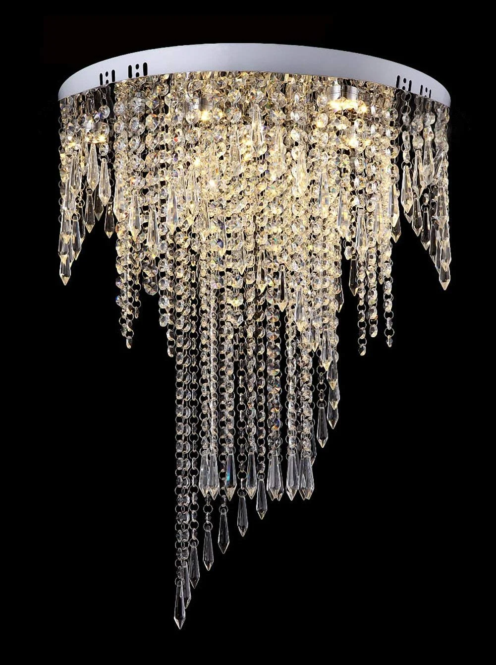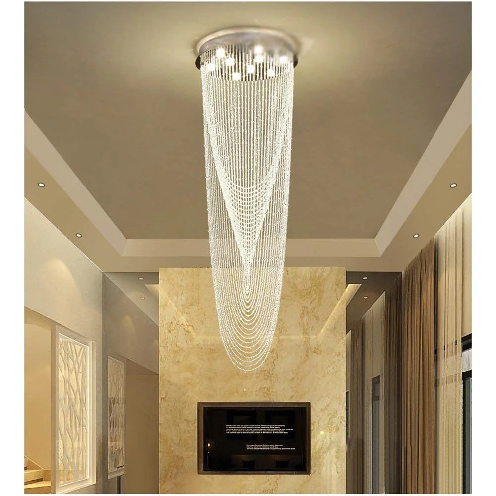 This elegant and luxurious crystal cascade chandelier is a showstopper. Designed to fill high rooms and spaces like stairwells, two-storey foyers and living rooms. The exquisite design includes glass crystal beads each cut for multi-faceted refraction effect and a stainless-steel base.