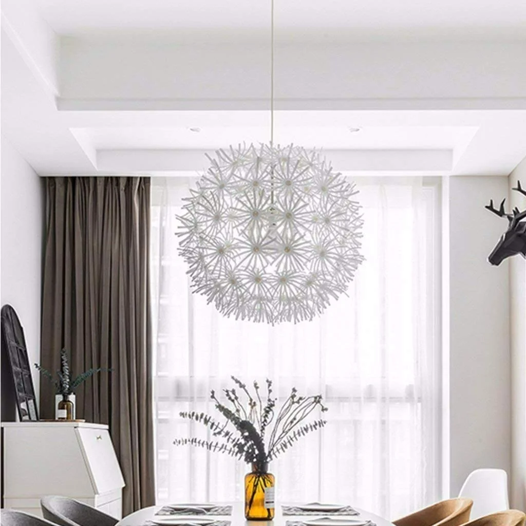 Wispy and delicate. Funky and charming. This white dandelion pendant light is a ball of charm. Made of stainless steel and polypropylene, this ball of light is charming as is, light it up and it will throw soft warm light and fun shadows too!