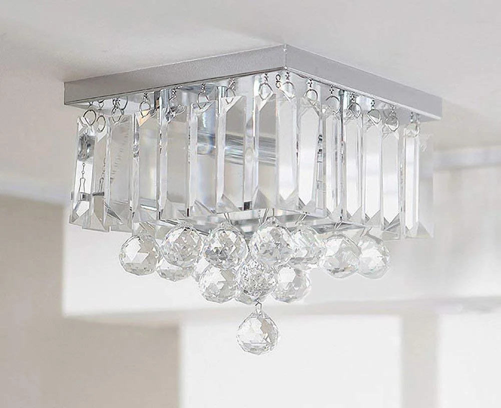 This gorgeous crystal and stainless-steel chandelier can light up any room. Its square flush mount features four LED bulbs lighting the crystals which bounces the light in every direction, creating a burst of mesmerising lights.