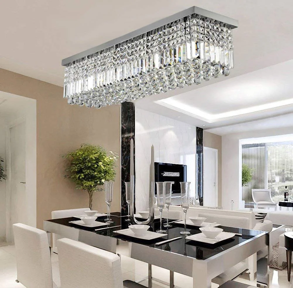 Crystals glow romantic, mesmerising and hypnotic light. The play of lights against its cuts and plains allow it to sparkle. This rectangular teardrop crystal chandelier is spectacularly beautiful. Best for grand spaces like living rooms, foyer, ballrooms and hallways.