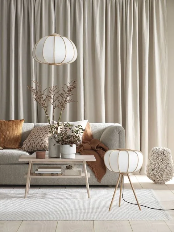 Graceful, timeless, and beautiful! This classy living room is delicately designed with elegance in mind. Featuring neutral colours, the room features a comfy sofa, heavy curtains, plant accents, a thin area rug, and gorgeous paper lamps.