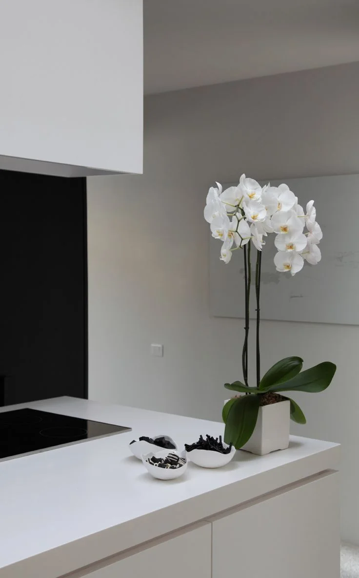 The bright greens of succulents add the much needed pop of colour to a stark white kitchen.