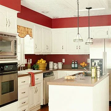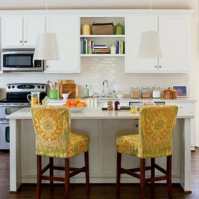 Make your bar seats the focal point of your kitchen. Bright red, black, or deep blue seats really make a visual statement against crisp whites.