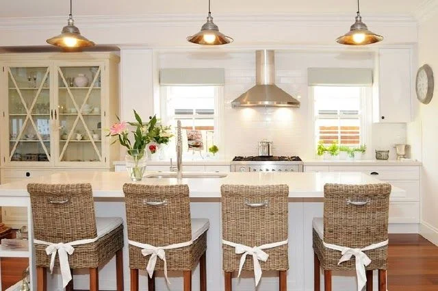Bring in the gentle country charm with wicker furniture. They look great against the white.