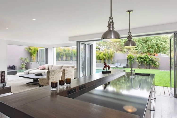 There are stunning kitchens that will make you look up. The striking kitchen below was designed by Hardcastle. The kitchen cabinets, wooden flooring, the row of clerestory windows and walls have been cleverly positioned to make an illusion of a floating kitchen ceiling.
