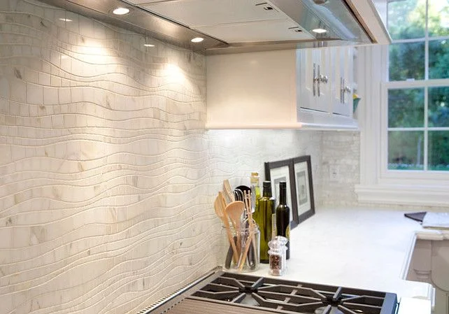 This wavy splashback idea has an emphasis on clean lines and structure, making it a perfect choice for minimalist kitchens.
