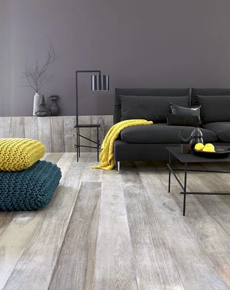 Leaving your living room bare is contemporary, trendy and sensible. This ultramodern living room features cool grey walls, stripped hardwood floor and black furnishings. Bright floor pillow seats are added for comfortable seating and pops of colour.