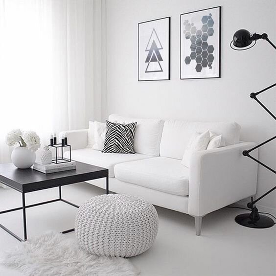 Complement your all-white living room with eye-catching black accents. The white minimalist living room gets a styling boost from the minute detailing of its décor. Different black lines, shapes, and patterns give the room an interesting and chic look.