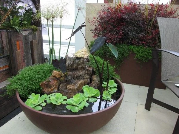 Miniature centrepieces are ideal for smaller yards. A combination of rock, water, and greens in a large bowl planter will spice up a garden.